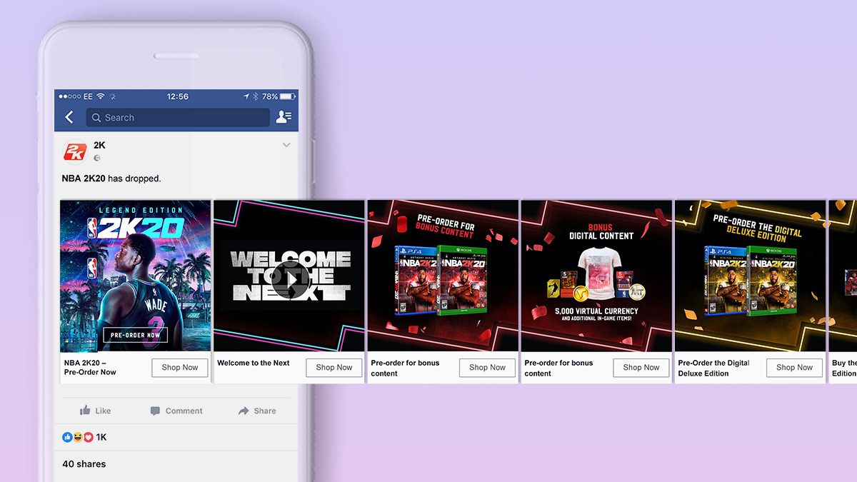 Taking elements from the NBA 2K keyart I created a Facebook canvas with a carousel for each pre-order SKU.