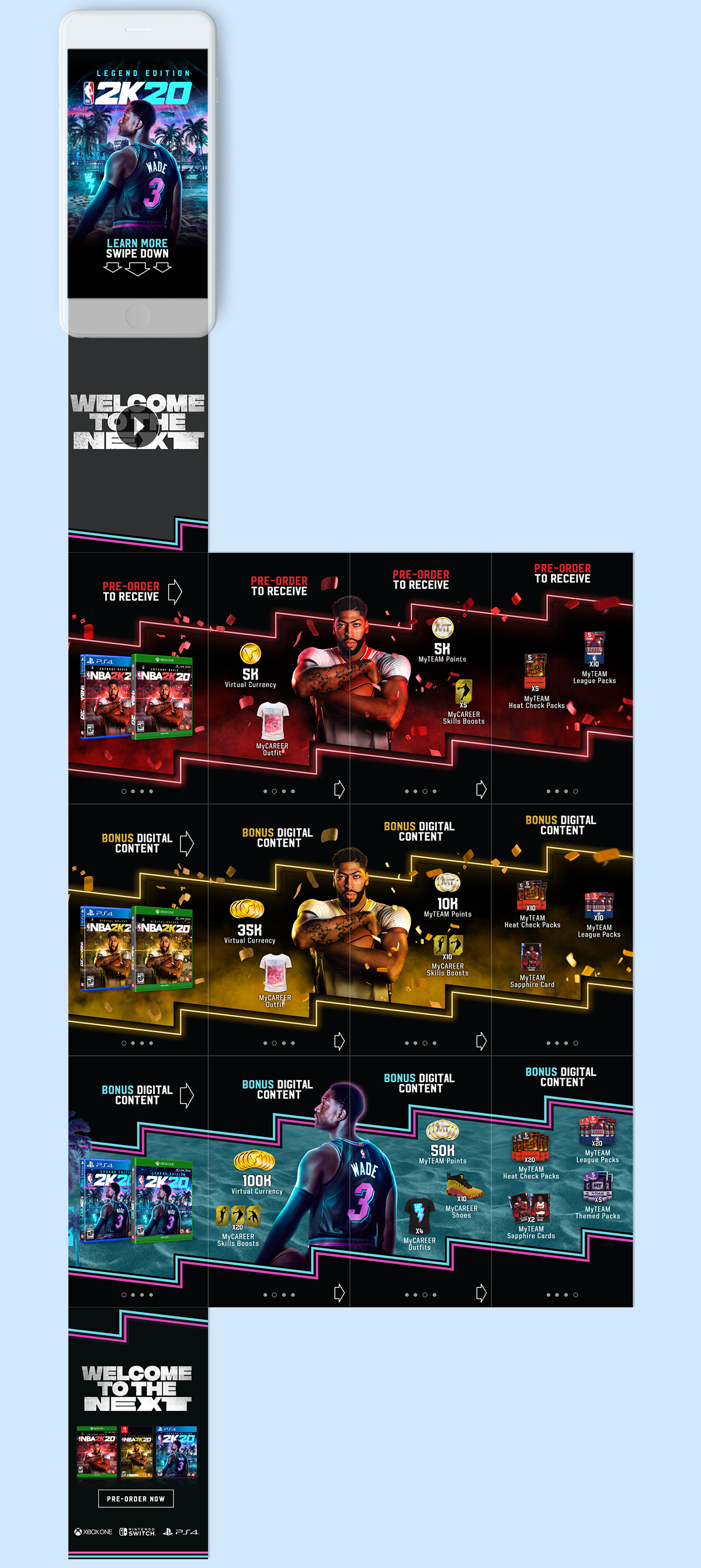 Premium content featured across three different SKUs - NBA 2K2O, NBA 2K2O Deluxe Edition and NBA 2K2O Legend Edition to drive people to pre-order.
